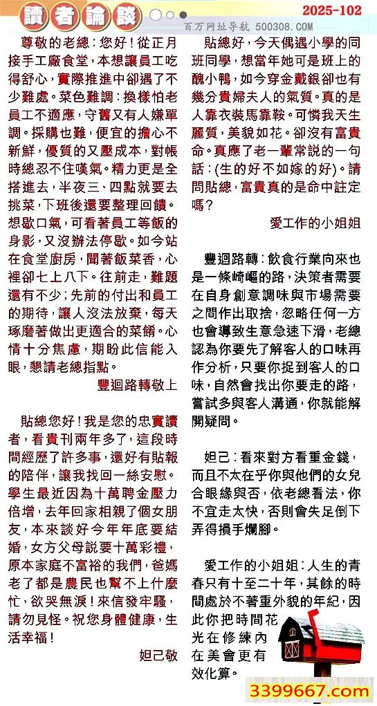 【1】.尊敬的老總:您好!從正月接手工廠食堂,本想讓員工吃得舒心,實際推進中卻遇了不少難處。菜色難調:换樣怕老員工不適應,守舊又有人嫌單調。探購也難,便宜的擔心不新鮮,優質的又壓成本,對帳時總忍不住嘆氣。精力更是全搭進去半夜三、四點就要去挑菜,下班後還要整理回饋想歇口氣,可看著員工等飯的身影,又沒辦法停歇。如今站在食堂廚房,聞著飯菜香,心裡卻七上八下。往前走,難題還有不少;先前的付出和員工的期待,讓人沒法放棄,每天琢磨著做出更適合的菜饈。心情十分焦慮,期盼此信能入眼,懇請老總指點。====豐迴路轉敬上