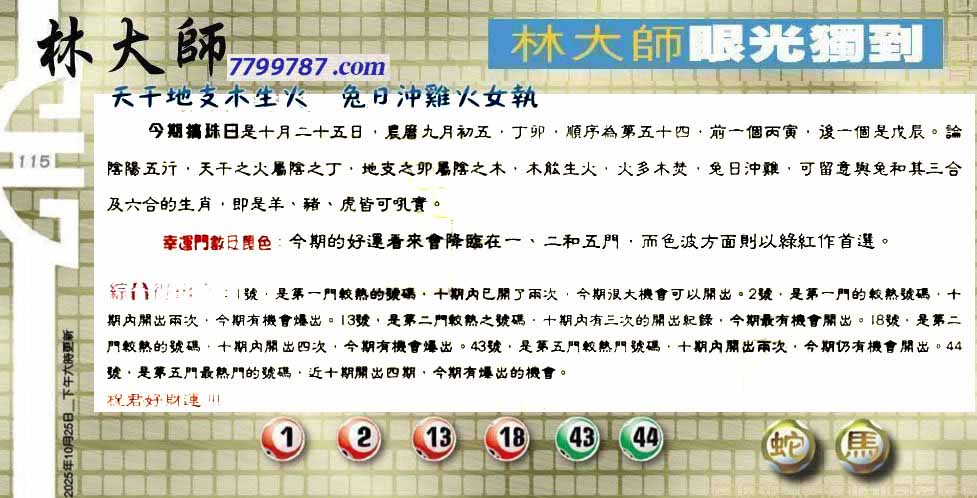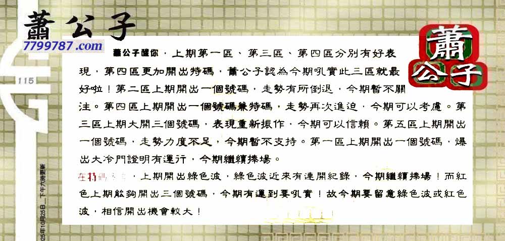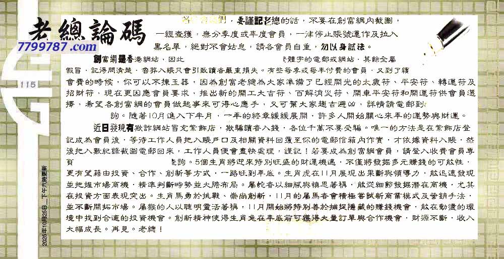 | 主题 :115期:六合皇金句/老总论码/萧公子/林大师/五行夺码/老总信箱截 |