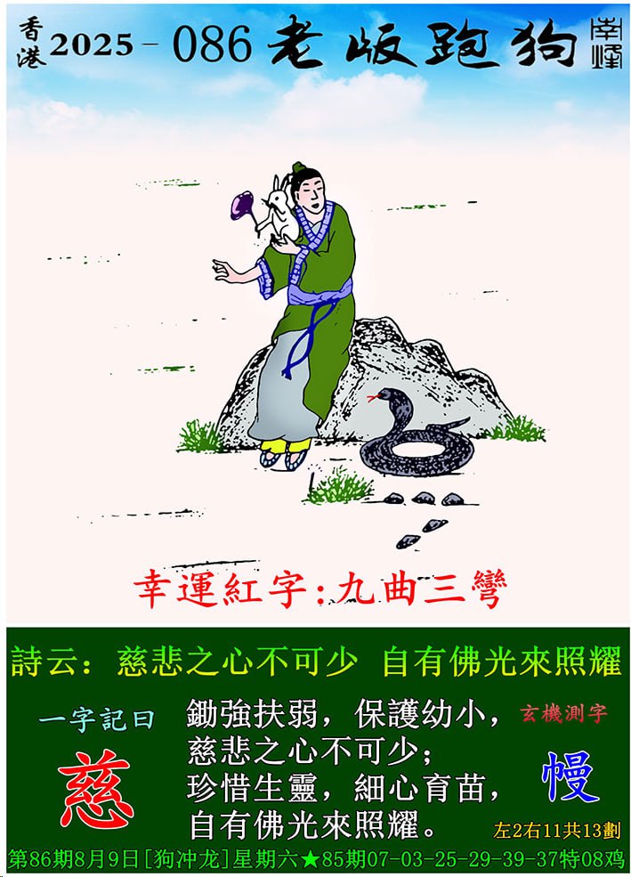 | 主题 :086期老版跑狗一字記之曰:【慈】 玄機測字:《幔》 |