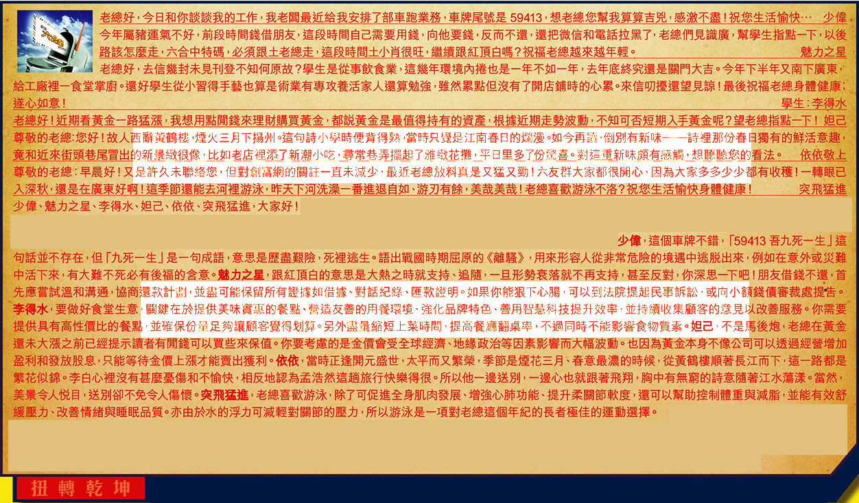 【1】.老總好,今日和你談談我的工作,我老闆最近給我安排了部車跑業務,車牌尾號是59413,想老總您幫我算算吉兕,感激不盡!祝您生活愉快...  少偉